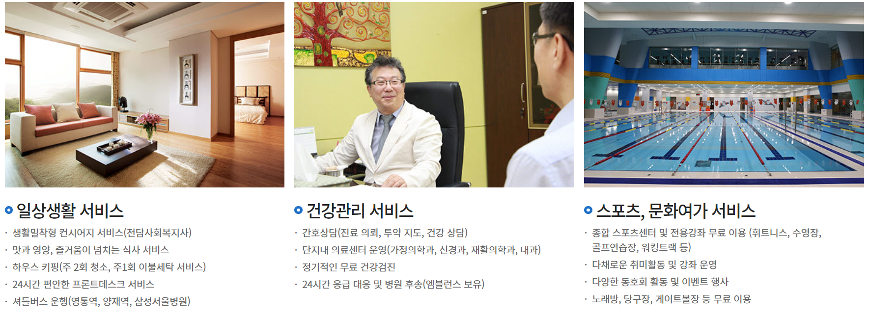 삼성생명공익재단에서 노인복지사업의 일환으로 운영 중인 삼성노블카운티는 주거, 의료, 요양, 문화, 스포츠 인프라가 모두 구성되어 있는 복합 실버타운입니다.