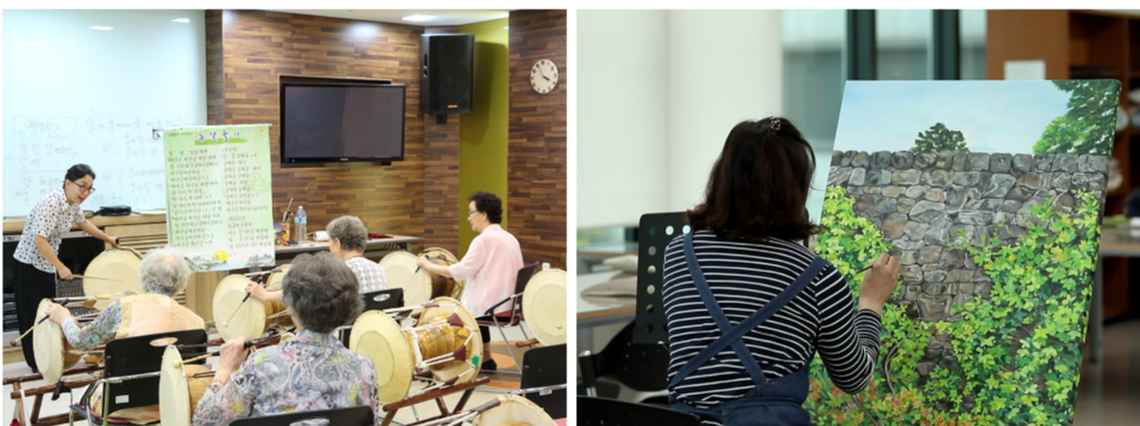 실버합창단, 선선회, 기우회(바둑), 마작, 중창단, 사진동호회, 게이트볼, 배드민터, 탁구, 당구, 골프 등 다양한 동호회 운영, 노래교실, 민요교실, 사물놀이 등 강좌 운영