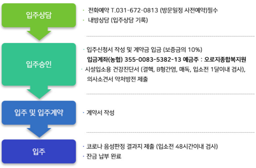 보증인과 동행으로 직접 내원하여 상담 후 입소 가능 여부를 결정하며, 천주교 신자인 경우 수원교구 미리내 본당으로 교적이적을 해야 합니다.