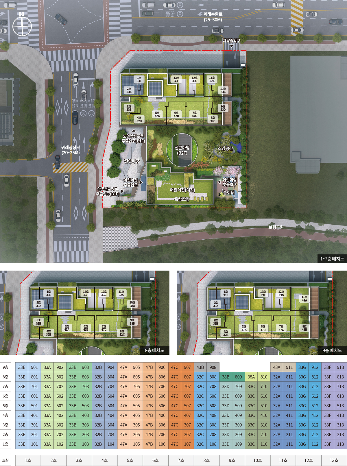단지 배치(1층~9층 규모로 평형대별 배치)
