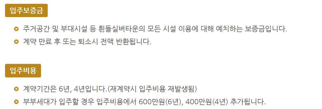 흰돌 실버타운입주비용이 다른 실버타운과 다른점이 있는데, 보증금과 입주비용이 따로 편성되어 있습니다. 입주 보증금은 주거공간 및 부대시설 등 흰돌실버타운의 모든시설이용에 대한 보증금이고 계약 만료 후 또는 퇴실 시에 전액 반환됩니다. 하지만 입주비용은 반환되지 않는 소멸되는 비용 입니다.