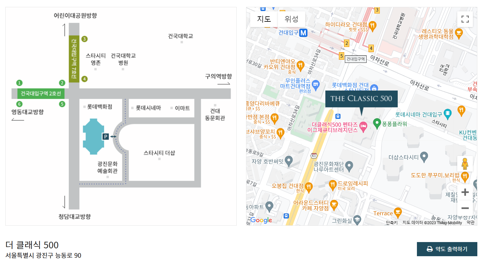 더 클래식 500은 광진구 능동로 90에 위치해 있으며 청담대교 · 영동대교 · 동부간선 강변북로 등 편리한 기반시설과 지하철 · 버스의 대중교통 이용이 용이해 빠르게 이동할 수 있답니다.^^