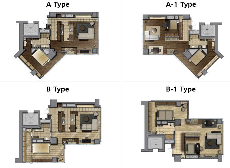 주거시설은 모두 전용 184㎡(56py)형으로 4가지 타입으로 나눠져 있답니다.