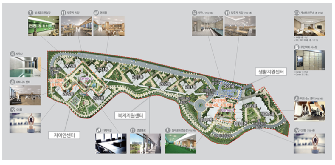 주거동은 센터 1(101동), 센터 2(201~207동)로 나뉘어져 있고 노래연습실/탁구장/식당/골프연습장 등 부대시설도 나뉘어져 있답니다.