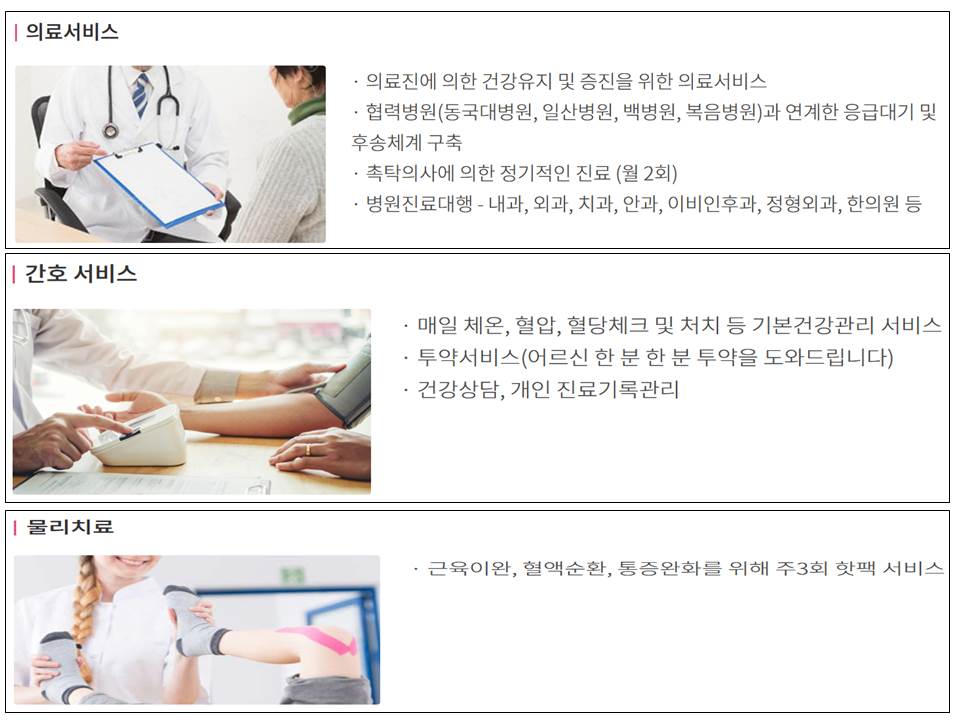 | 3층 | 체력단련실, 독서실, 컴퓨터실, 프로그램실, 간호사실, 요양보호사실, 샤워실, 대피공간, 화장실, 세탁실, 생활실, 강당 및 로비 |