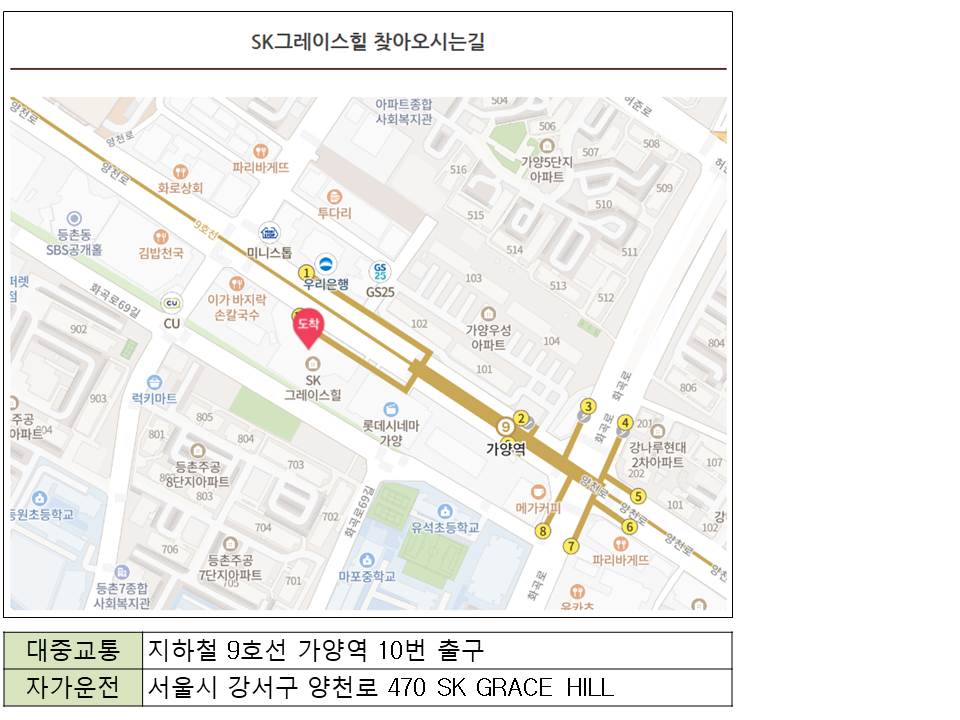 서울시 강서구 양천로 470에 위치하고 있으며 급행·완행이 모두 정차하는 지하철 9호선 가양역 10번 출구에 바로 연결되어 있으며 9호선 가양역, 올림픽도로, 자유로와 즉시 진출·입이 가능한 곳입니다.