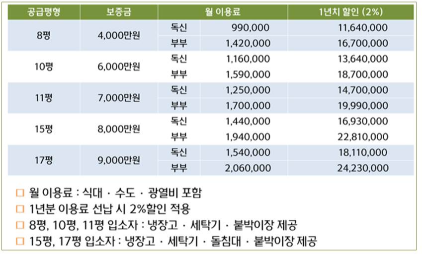 다양한 평형대의 주거 공간과 적절한 보증금, 월생활비