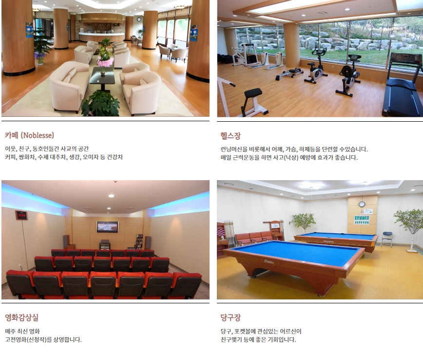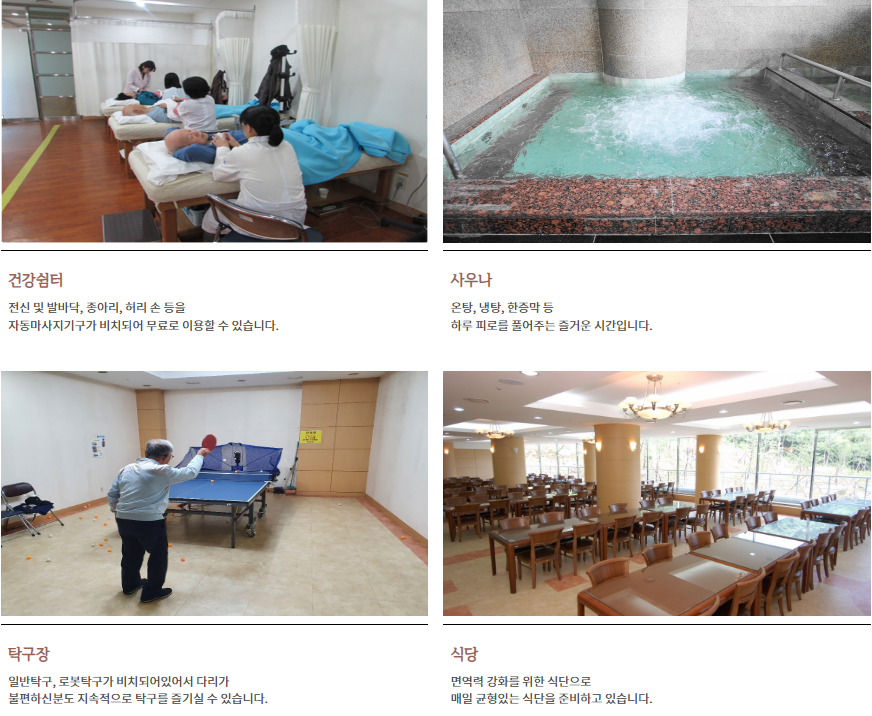 - 24시간 간호사가 대기중이며, 입주자 개인건강카드 관리와 숙련된 전문의가 건강진찰을 실시하여 언제든지 안심하고 진료 서비스 가능
