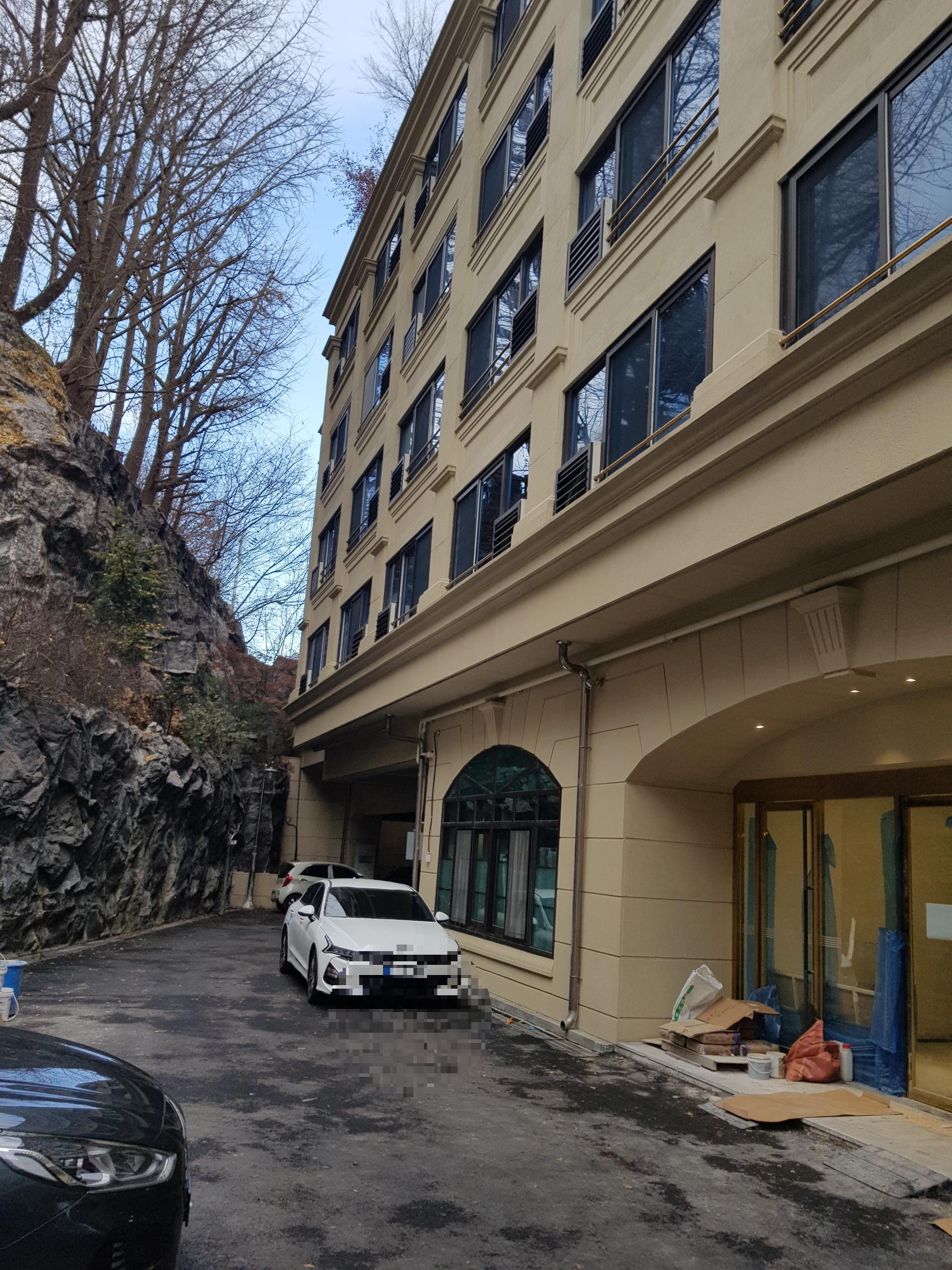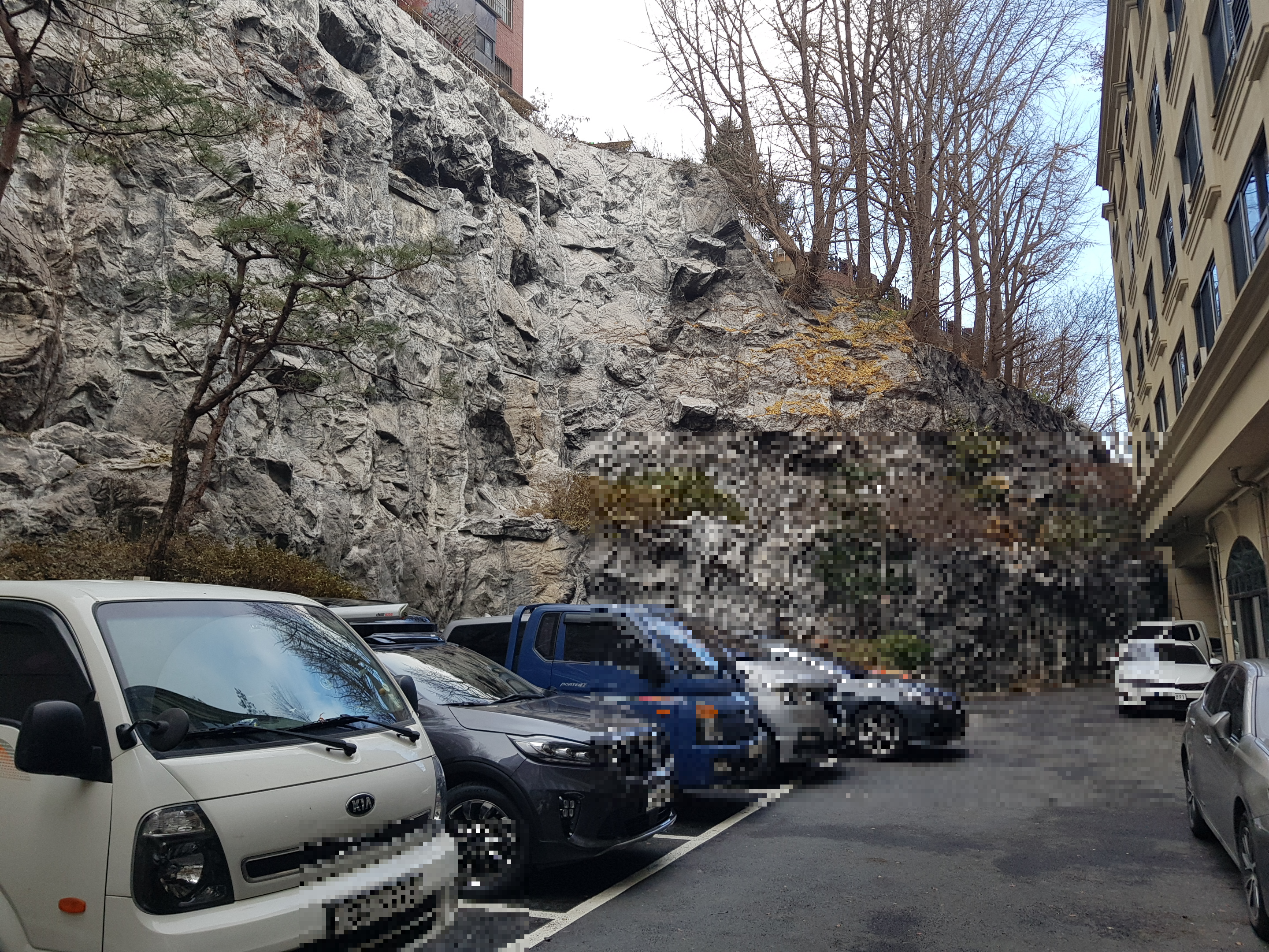 건물 뒤편에 지상 주차공간에 10대 정도 주차할 수 있으며 후면 벽면이 인공암벽으로 되어 있습니다.