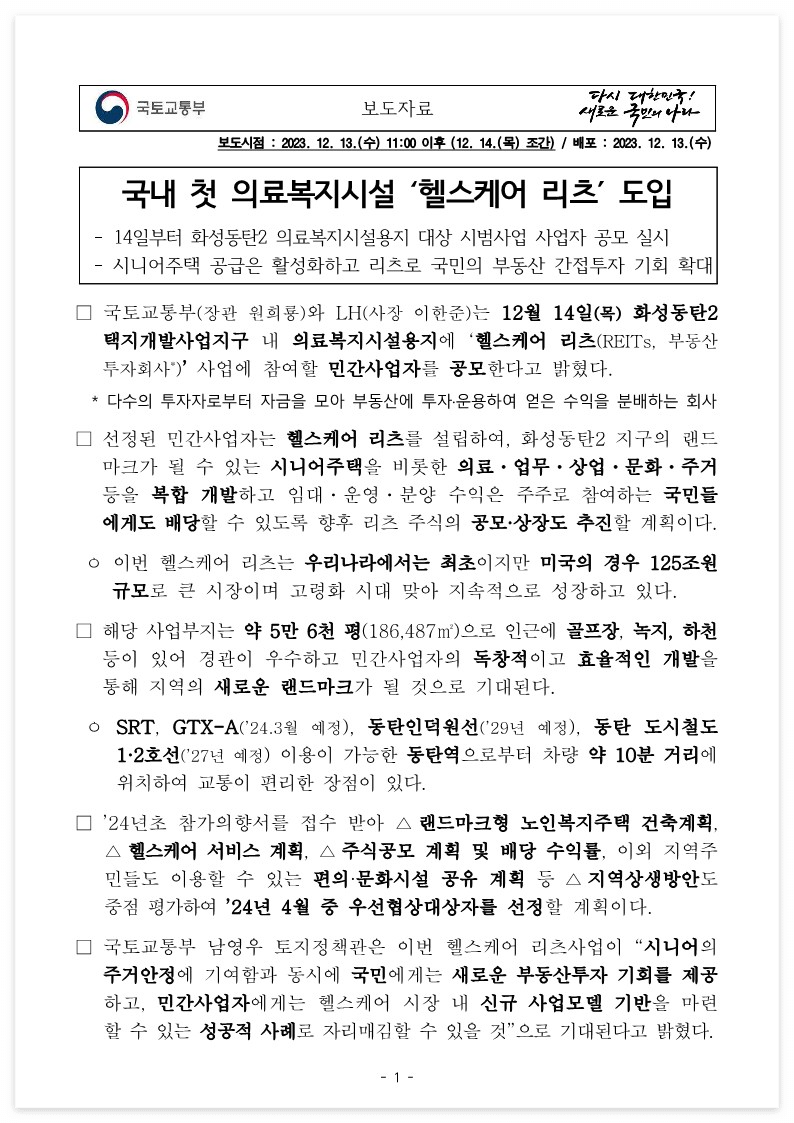 이번 12월13일 국토교통부와 한국주택토지공사(LH)는 경기도 화성 동탄2 신도시 내 의료복지시설 전용부지에 '헬스케어 리(REITs 부동산투자신탁)' 사업을 진행할 민간 사업자를 공모한다고 발표했습니다.
