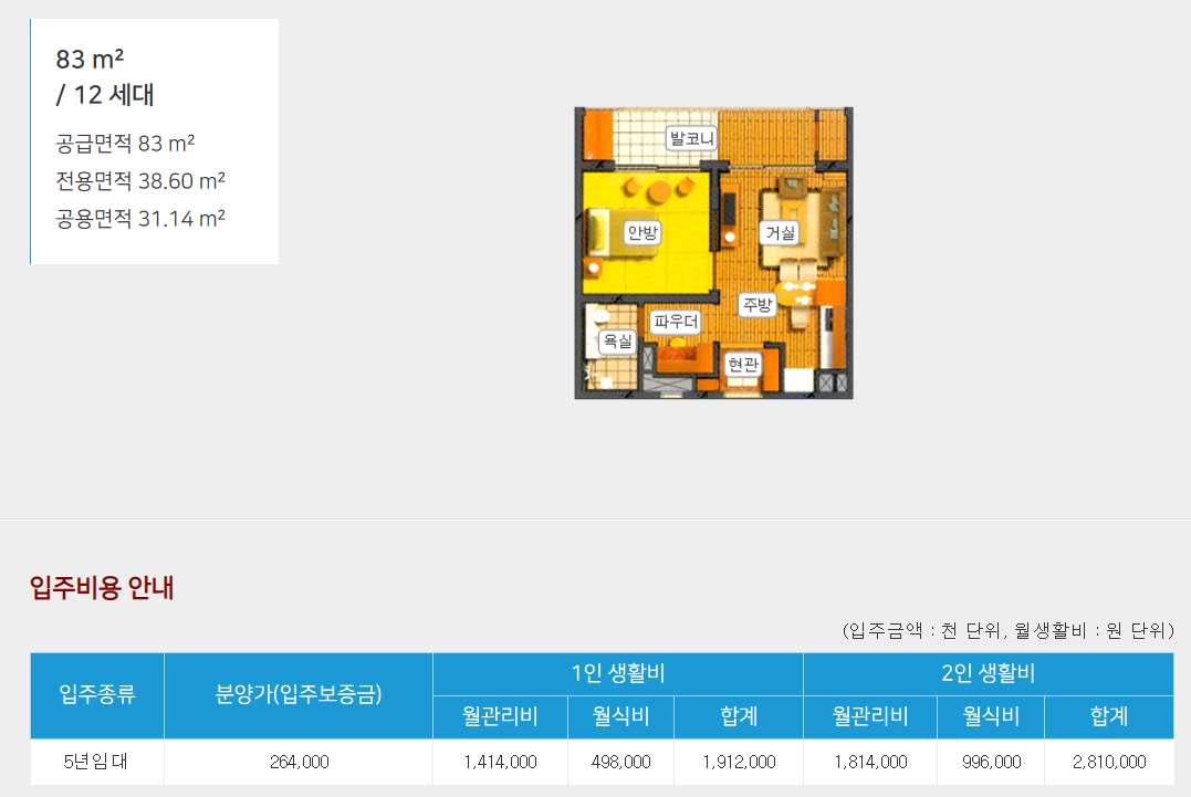 ■ 2인 입주시 시설운영관리비 400,000원, 식대 450,000원 추가됨(60끼 의무식 / 2인 입주시 총 850,000원 추가)