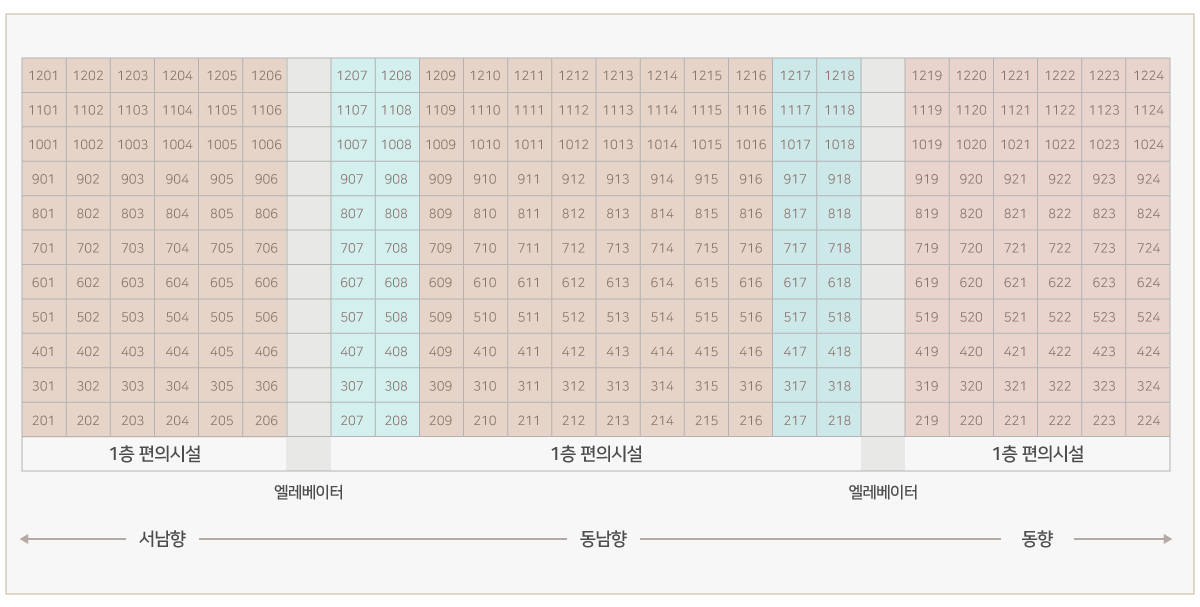 ○ 전세대 배치도(E/V 기준으로 좌측 서남향, 중앙 동남향, 우측 동향)