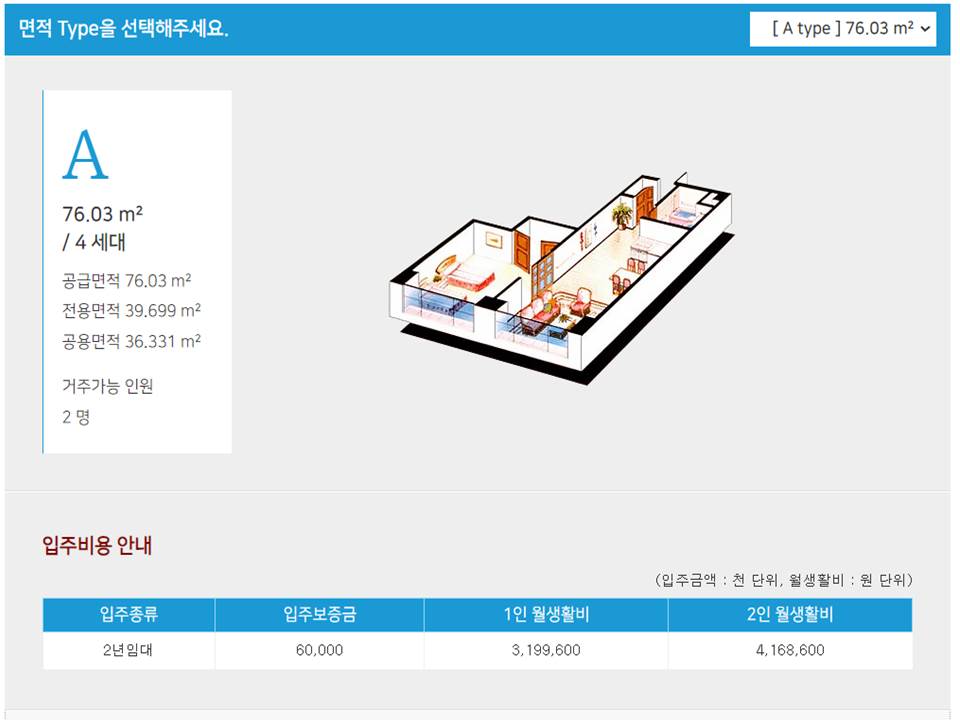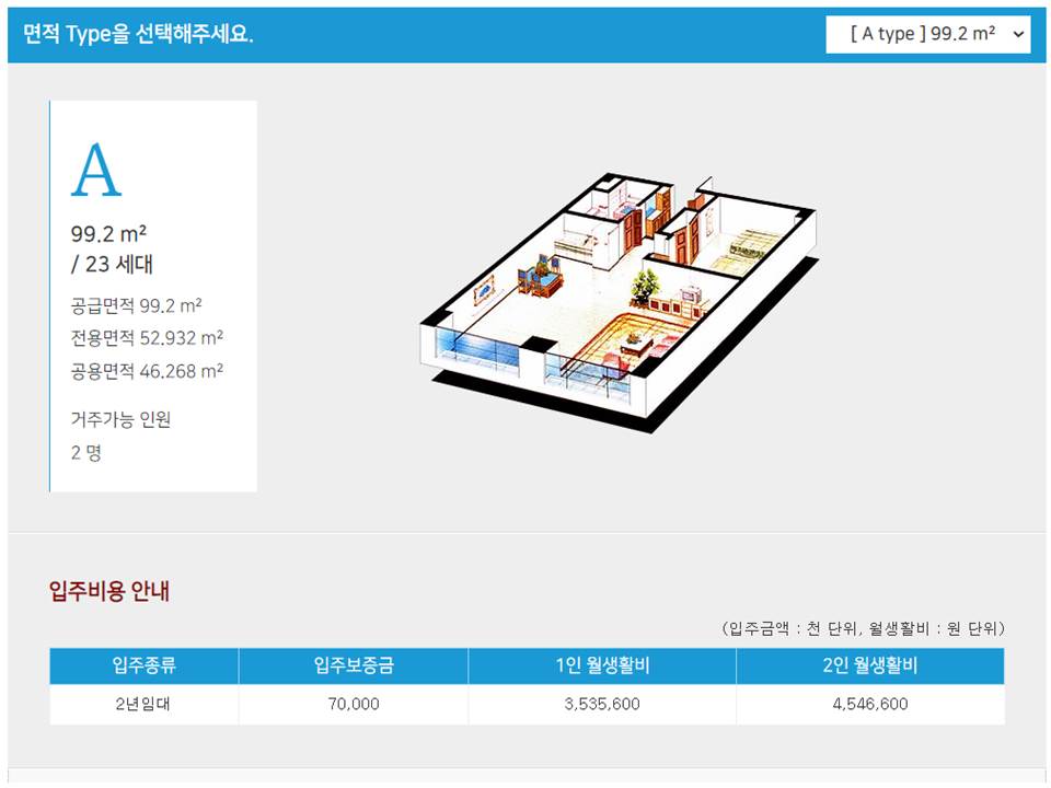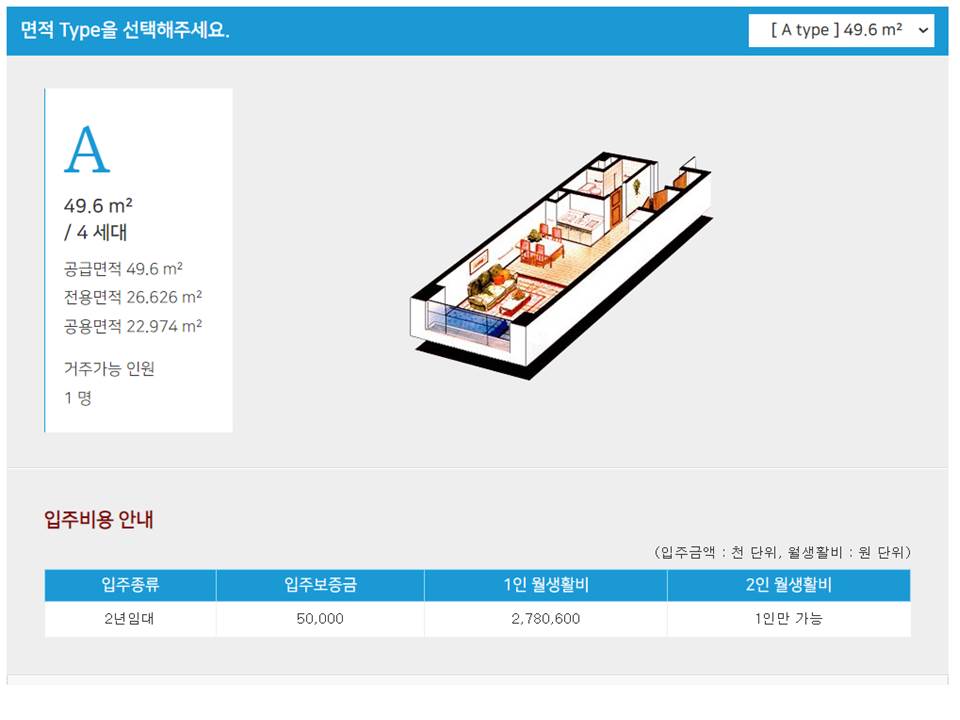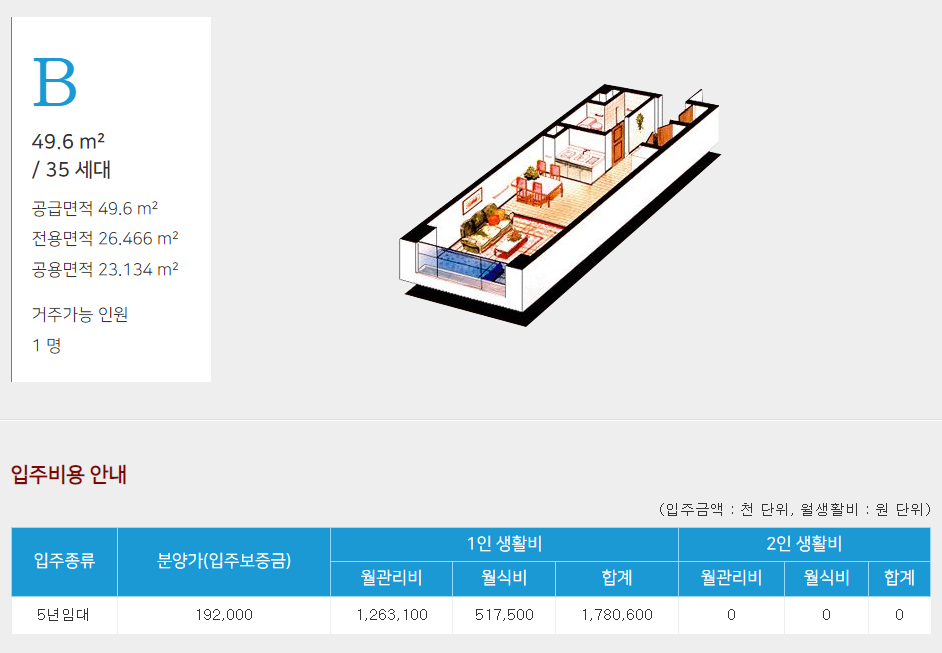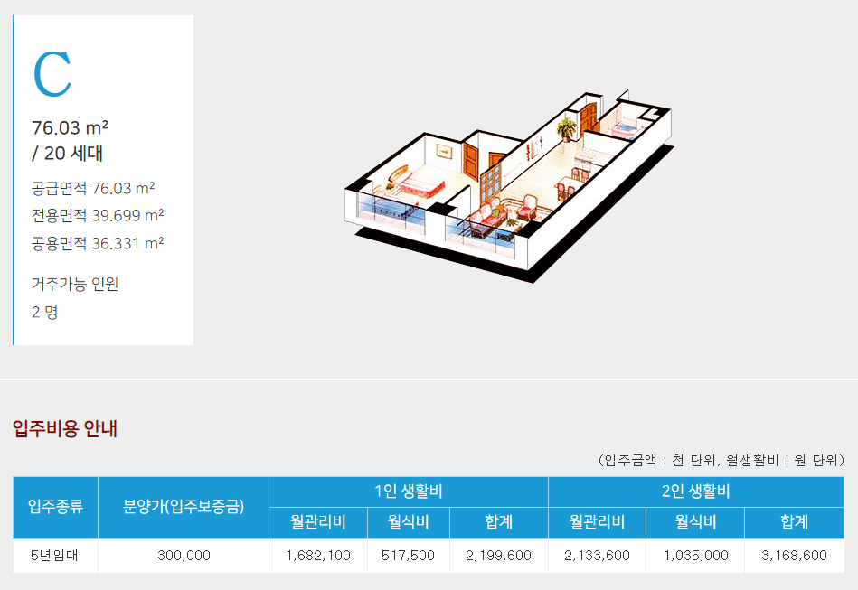 ■ 월 생활비 : 월 관리비 + 월 식비 (월 생활비는 서울시 생활물가지수에 따라 매년 변동될 수 있습니다.)