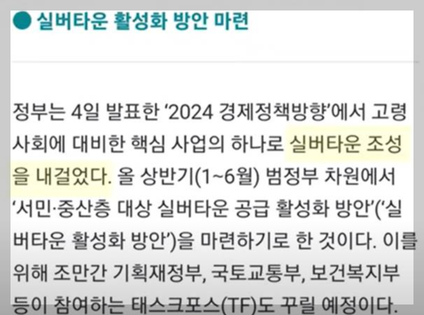 정부는 1월 4일 발표한 24년 경제정책방향에서 실버타운 조성 사업 계획을 발표했습니다