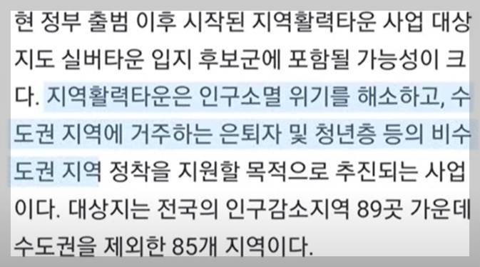 전국적으로 고령화가 심한 지역, 인구 감소지역 89개 지역에 지역활력타운 사업이 추진되고 있는데 이곳(총 85개 지역)에 실버타운 공급을 같이 추진하겠다는 내용입니다.