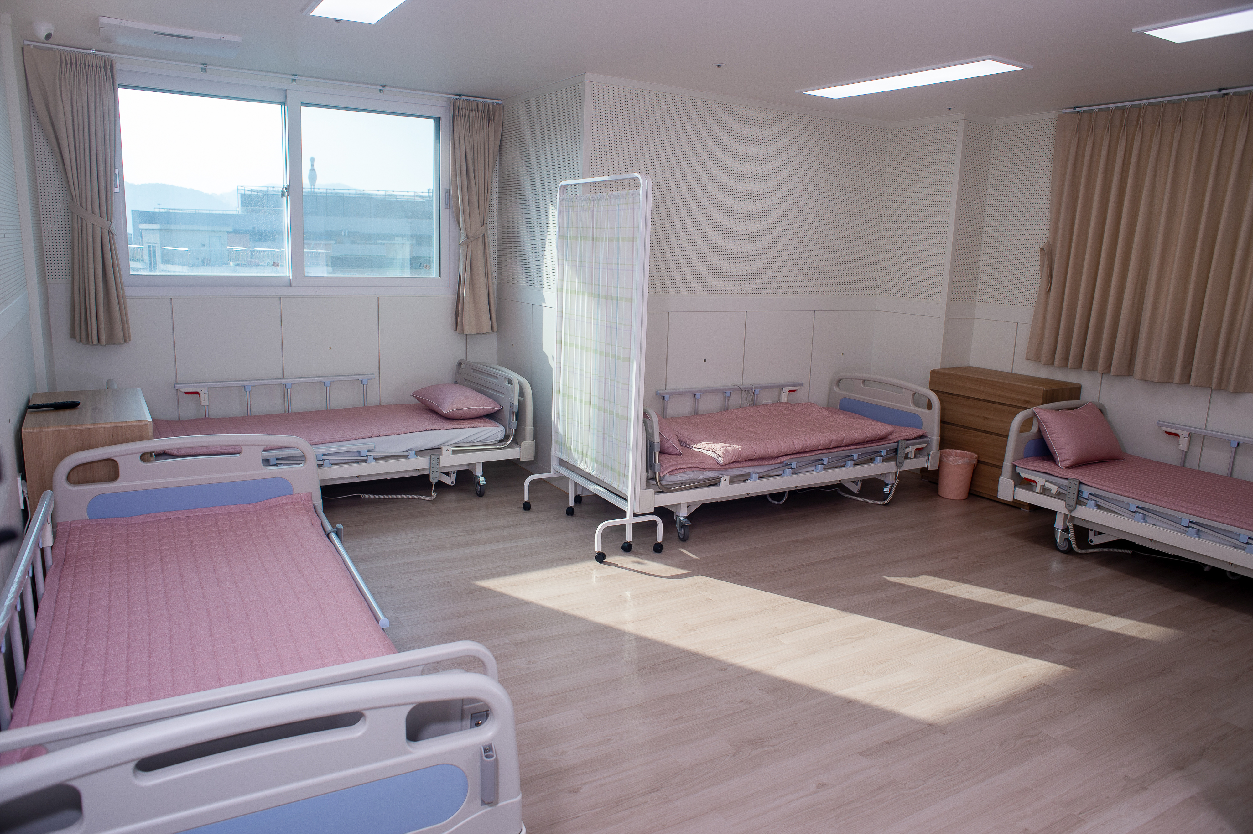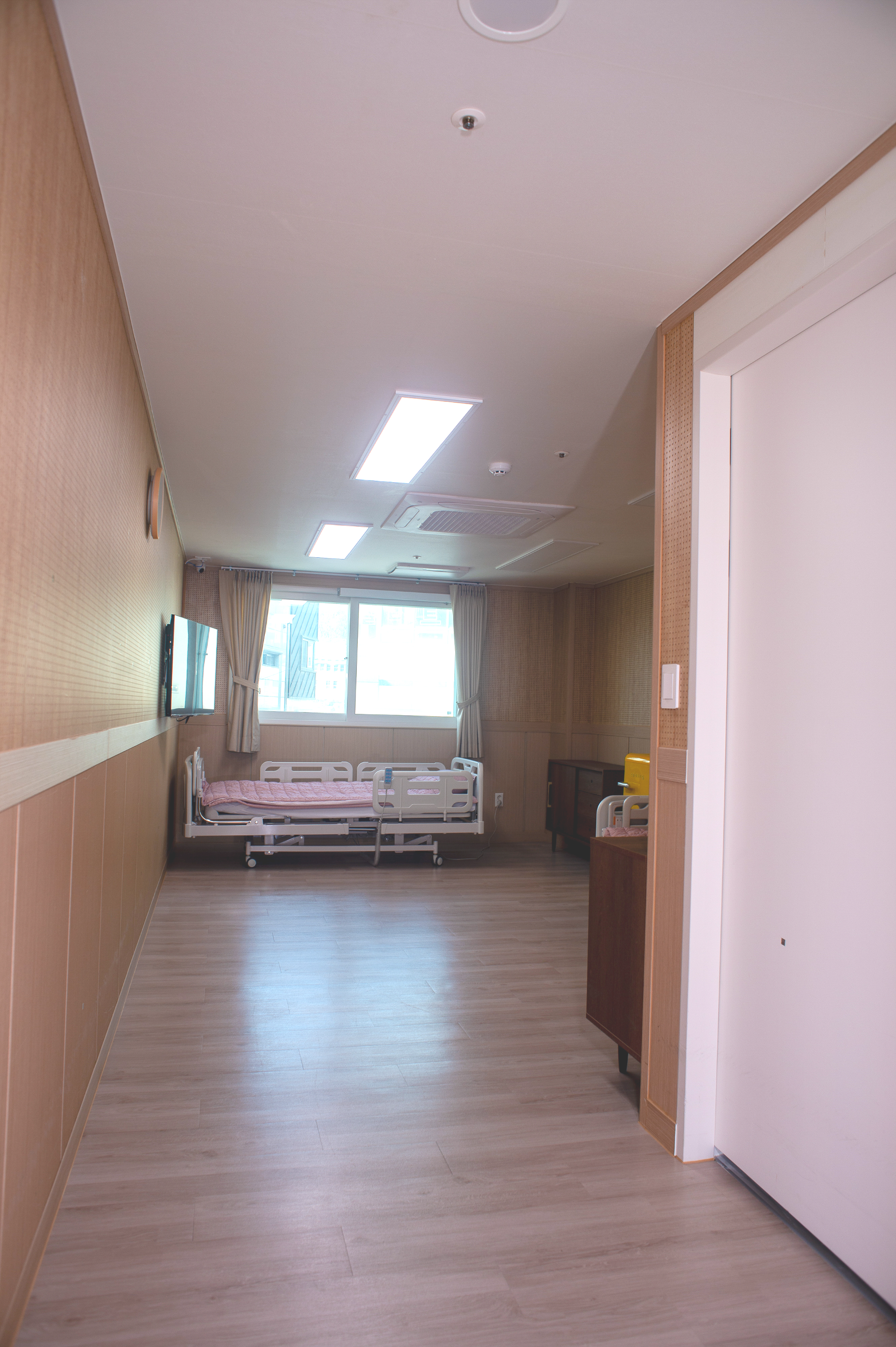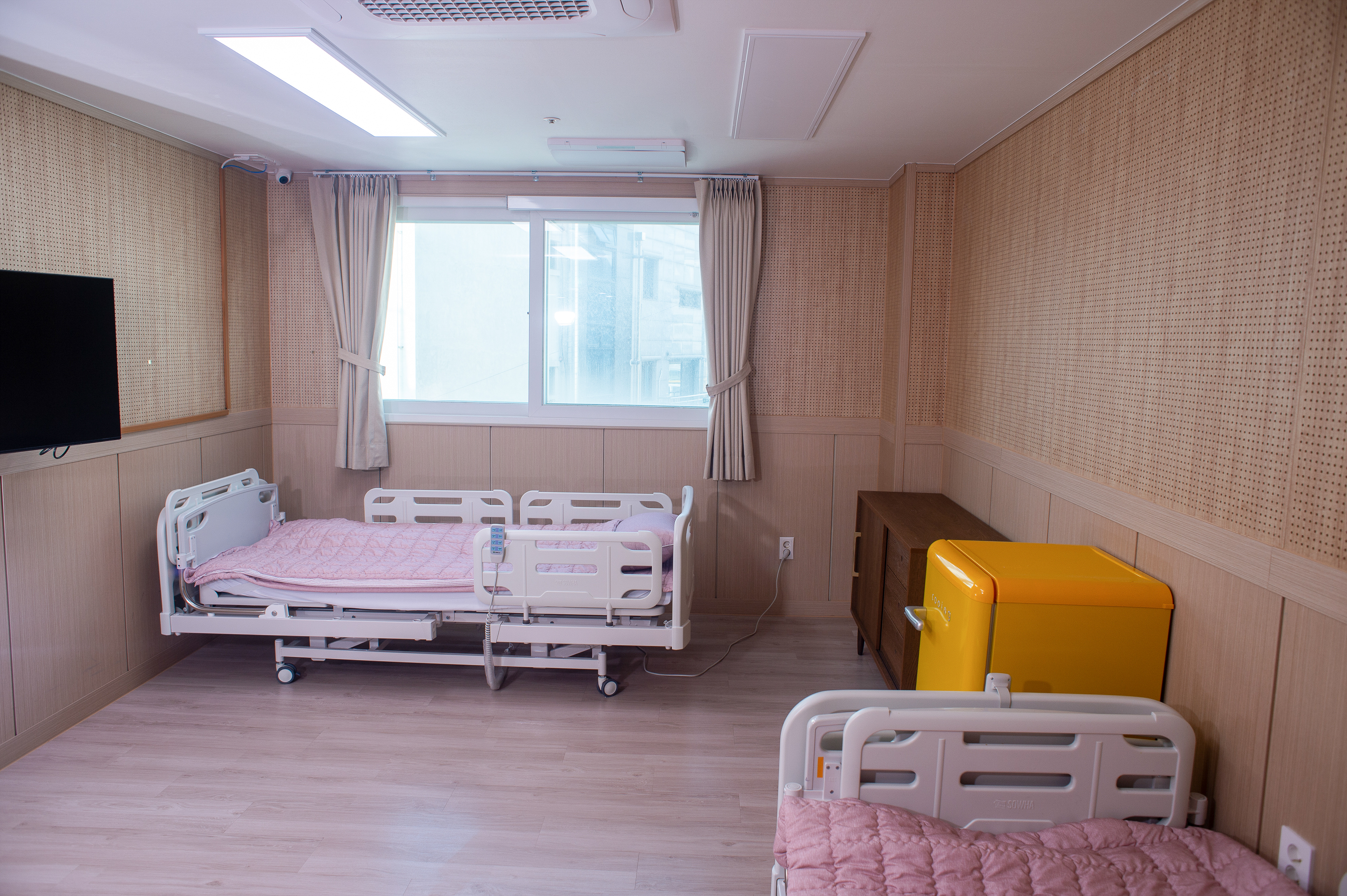 안전시설, 시스템에어컨, 공기순환기, 낙상방지 저상형침대, 넓은 공간, 다인실 내 욕실&화장실, 냉장고, TV, 수납공간, 선반 구비