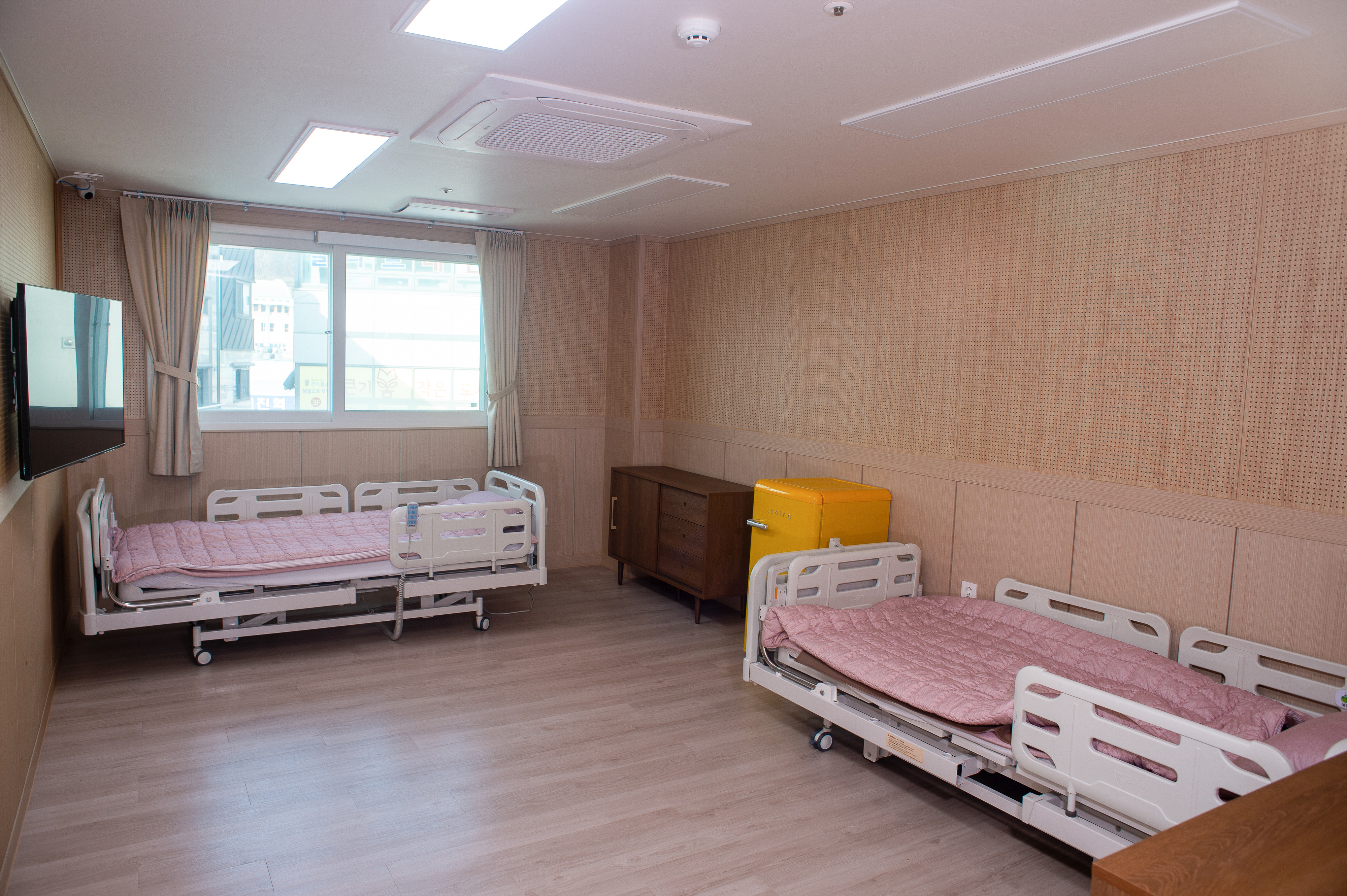 안전시설, 시스템에어컨, 공기순환기, 낙상방지 저상형침대, 넓은 공간, 2인실내 욕실&화장실, 냉장고, TV, 수납공간, 선반 구비
