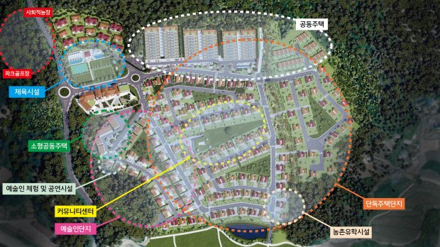 시설 : 500세대 주거단지, 예술인 특화단지, 농촌유학시설, 커뮤니티시설, 체육시설