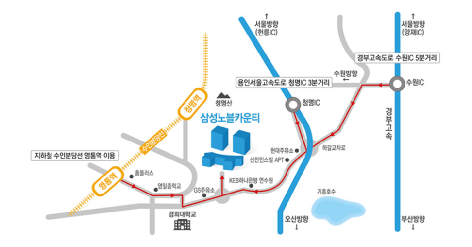 자연의 싱그러움과 도시의 편리함을 함께 갖추고 있는 삼성노블카운티는 서울 강남과 분당지역에서 차로 30분거리에 위치해 접근성이 뛰어나고 지하의 아름다우철 영통역과 서울 강남지역으로 셔틀버스를 운행하여 이동이 편리합니다.